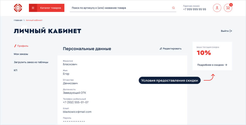 Авторизованный пользователь может видеть историю покупок, использовать инструменты личного кабинета и получить возможность увеличивать скидку на продукцию в зависимости от количества покупок.
