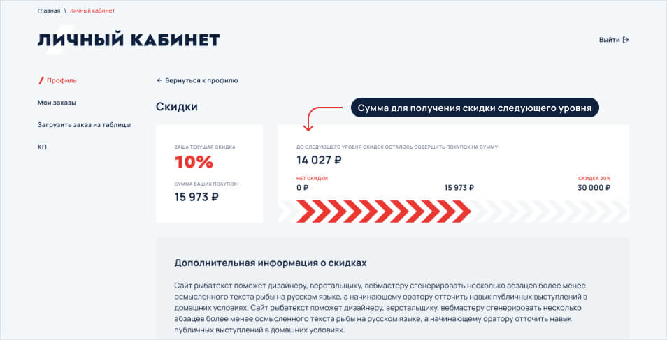 Провалившись вы можете ознакомиться с информацией и узнать на какую сумму необходимо совершить покупки для получения скидки следующего уровня.