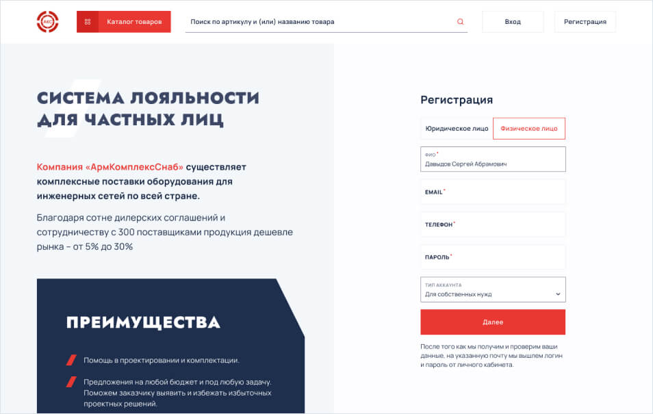 Личный кабинет покупателя интернет магазина AKS интуитивно понятен, так как интерфейс спроектирован в соответствии с устоявшейся структурой. Просмотр товаров доступен незарегистрированным пользователем, однако для совершения покупки требуется регистрация.