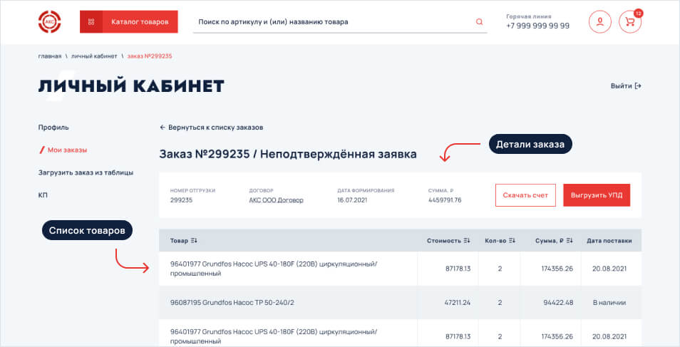 В случае если КП было сформировано давно и после этого в товарной матрице произошли изменения, на детальной странице будет уведомление о статусе позиции, например “Снят с продажи”.