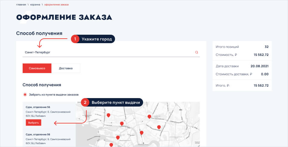 Для розничного лица предусмотрено два варианта доставки, доставка в пункт выдачи и самовывоз со склада. При выборе доставки в пункт выдачи, необходимо указать город, а затем выбрать пункт из списка предложенных.