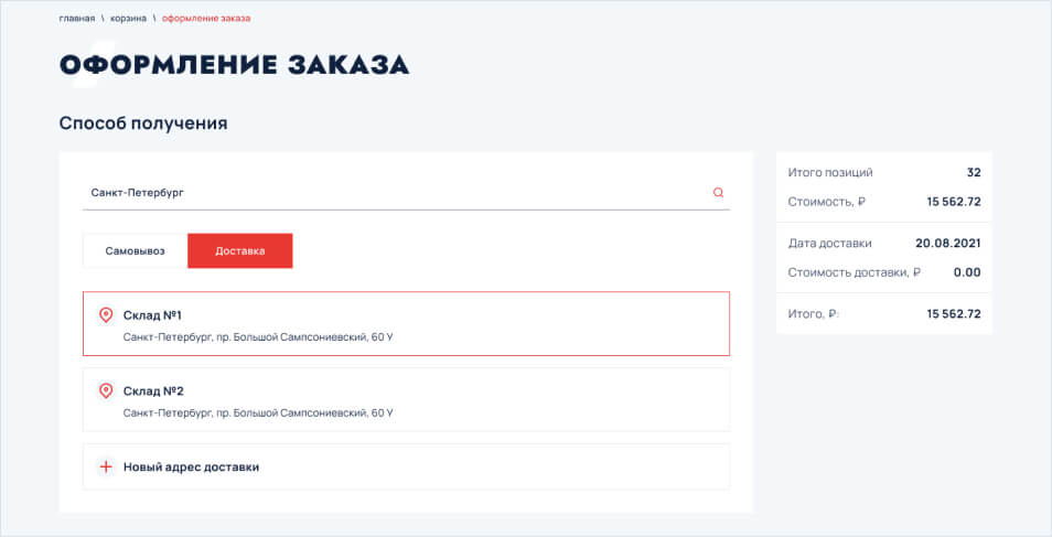 При выборе адреса доставки, необходимо указать один из тех, что ранее были указаны в разделе “Адреса доставки” или добавить новый адрес склада, нажав на кнопку добавления