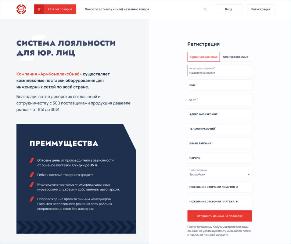 Помимо стандартных данных о компаниии, при регистрации можно указать пожелание к кредитному лимиту и отсрочке платежа. Эти условия обсуждаются и согласовываются индивидуально с каждым партнером.