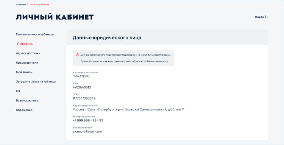 В данном разделе указана информация о юридическом лице, редактирование информации в ручном режиме не предусмотрено. При изменении данных о юридическом лице, необходимо связаться со своим менеджером.
