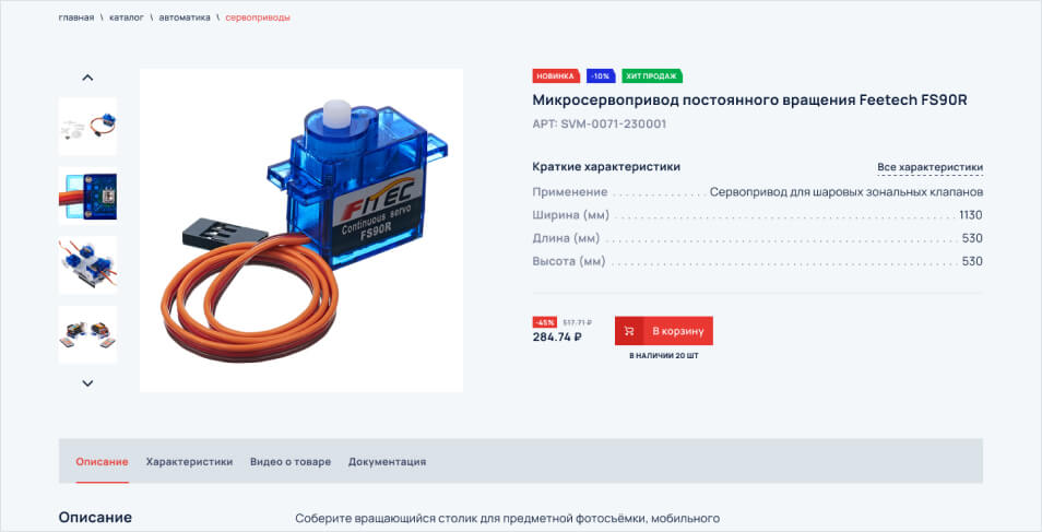 Карточка товара состоит из основных блоков, визуальная часть, блок с характеристиками, а также блок связанный с ценой и добавлением товара в корзину, для дальнейшей покупки.