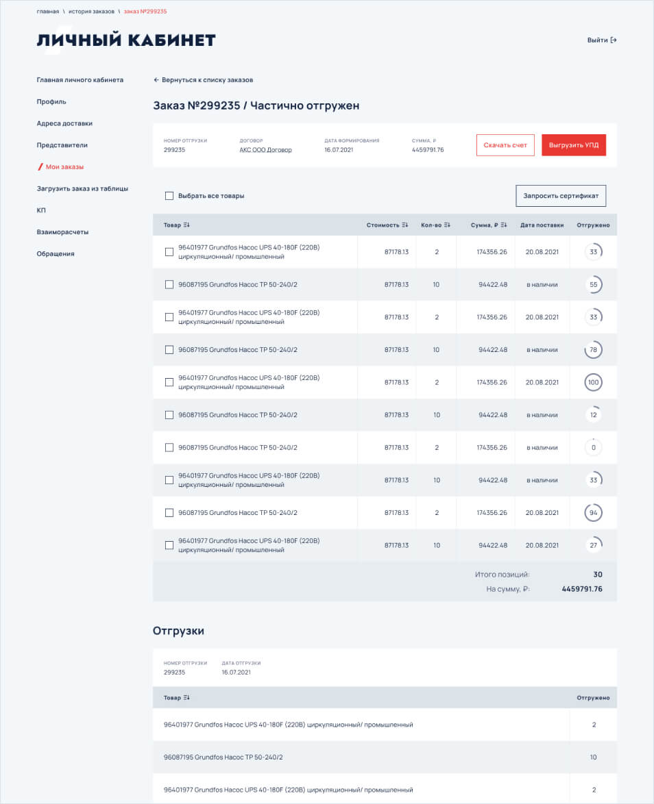 Для статуса “Частично отгружен” доступна информация о количестве отгруженных позиций выраженном в процентном эквиваленте. А под списком товарных позиций, приведен список отгрузок по заказу.